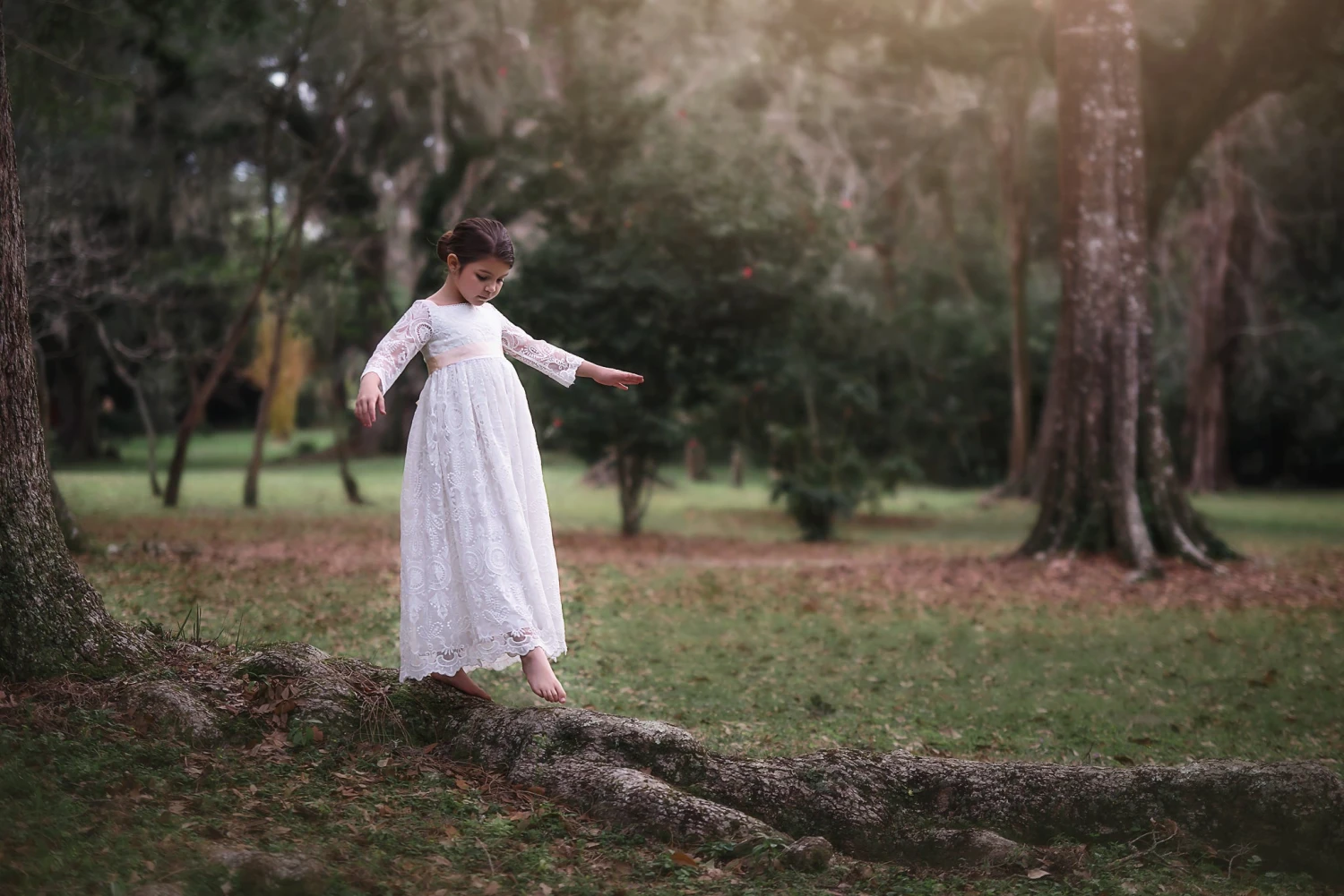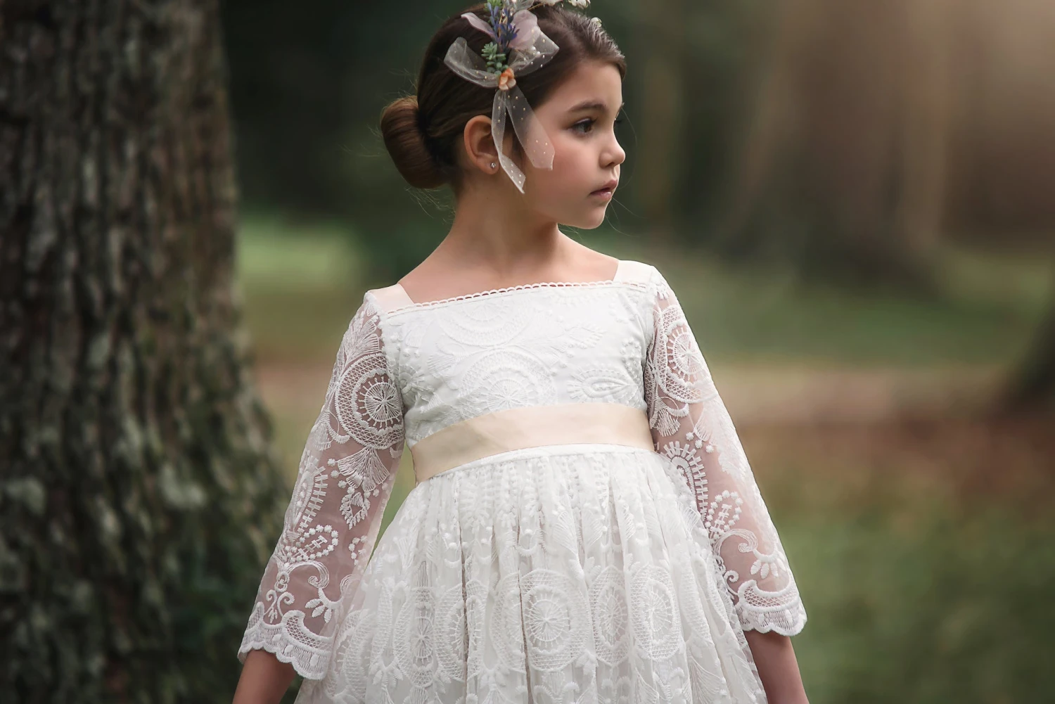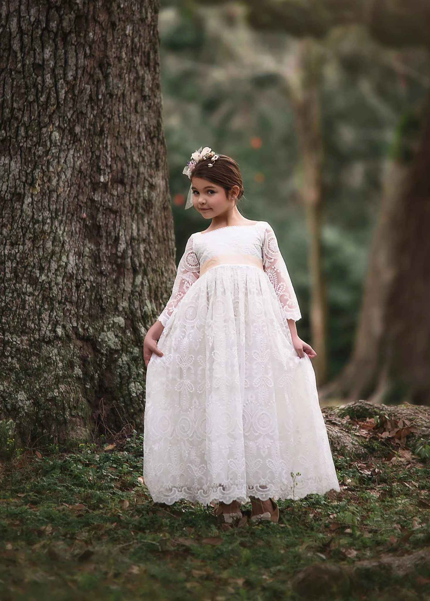 Simply a stunning gown that will knock your socks off! This luxury scalloped lace dress has a sweet square neckline, graced with a tan satin ribbon. The waistline self ties with a double faced satin belt, for the perfect touch of sweet. As with all of our gowns, our lace is never scratchy, comes fully lined with soft cotton and back zips. This is truly a keepsake to be passed down for years to come. Â