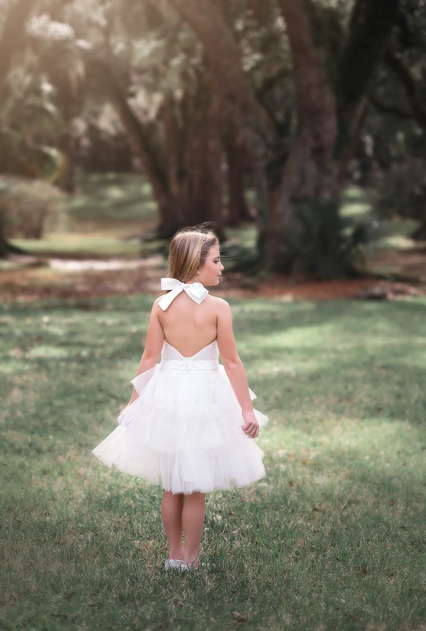 Meet Ameerah! She’s the perfect dress for a Summer day. 3 tiers of ruffled-tulle galore meet an elegant satin ribbon at the waistband and a tie-neck halter back for a look she’ll be twirling in all day.Â