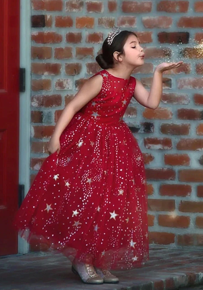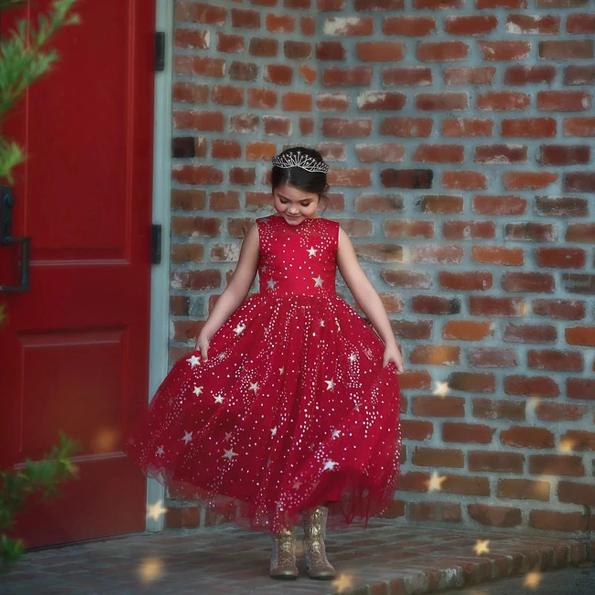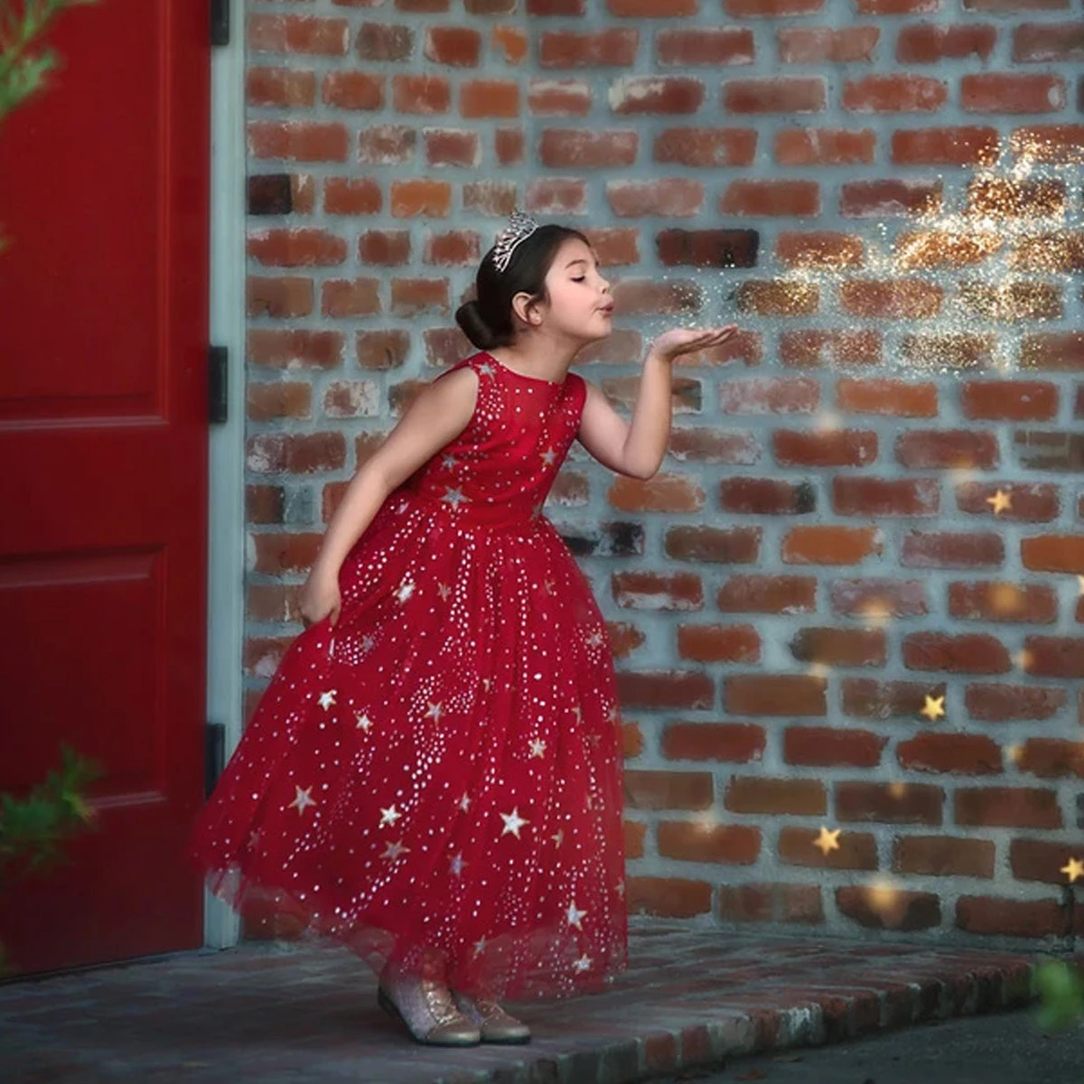 This gown will have all eyes on her! Stunning layers of navy blue tulling graced with a sweet, delicate sparkle star print, your girl will be spinning with excitement! Fully lined with soft cotton and lots of built in poof, this gown is both stunning and comfortable. Self ties and fully washable!Â