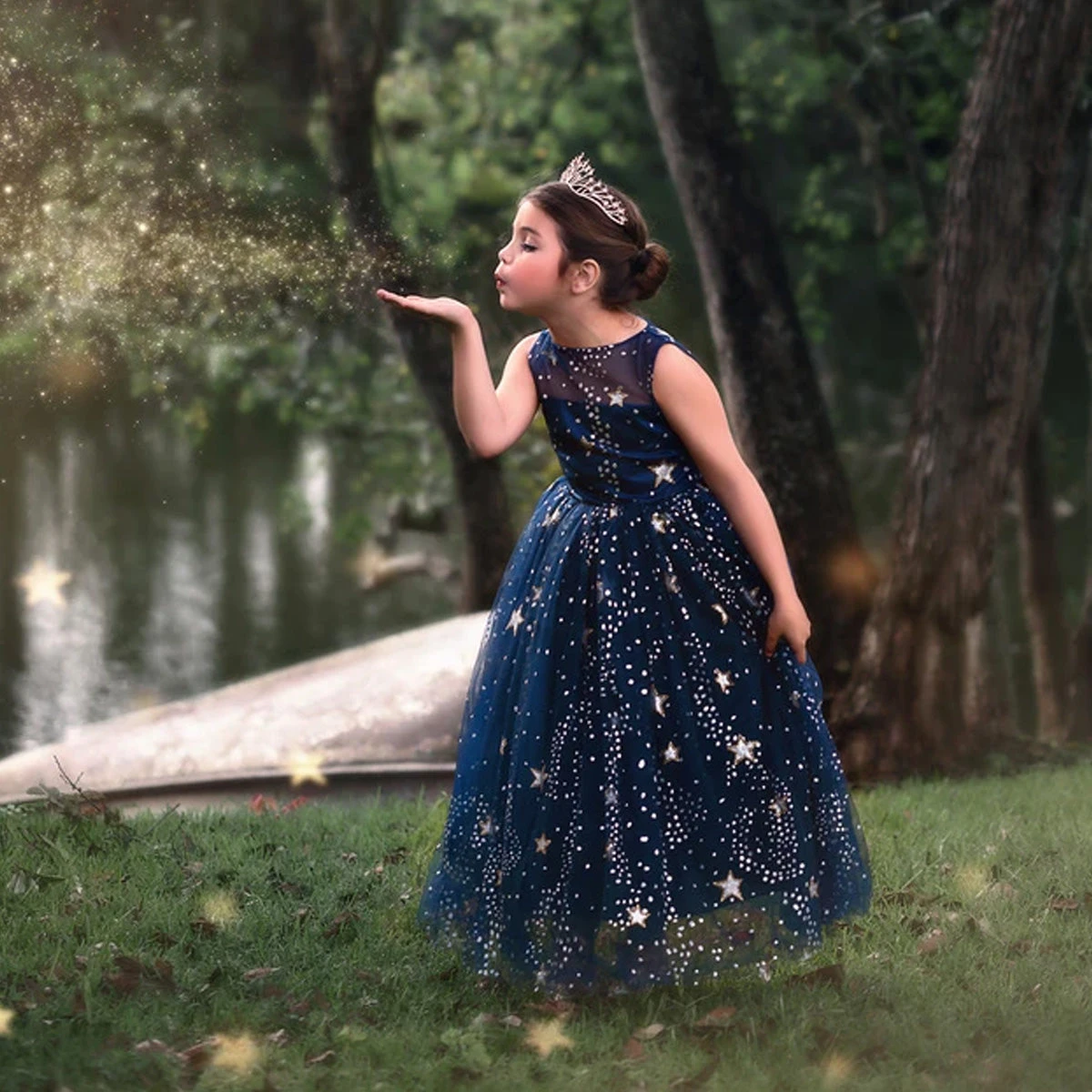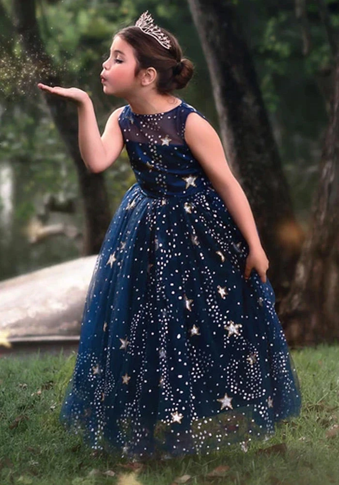 This gown will have all eyes on her! Stunning layers of navy blue tulling graced with a sweet, delicate sparkle star print, your girl will be spinning with excitement! Fully lined with soft cotton and lots of built in poof, this gown is both stunning and comfortable. Self ties and fully washable!Â