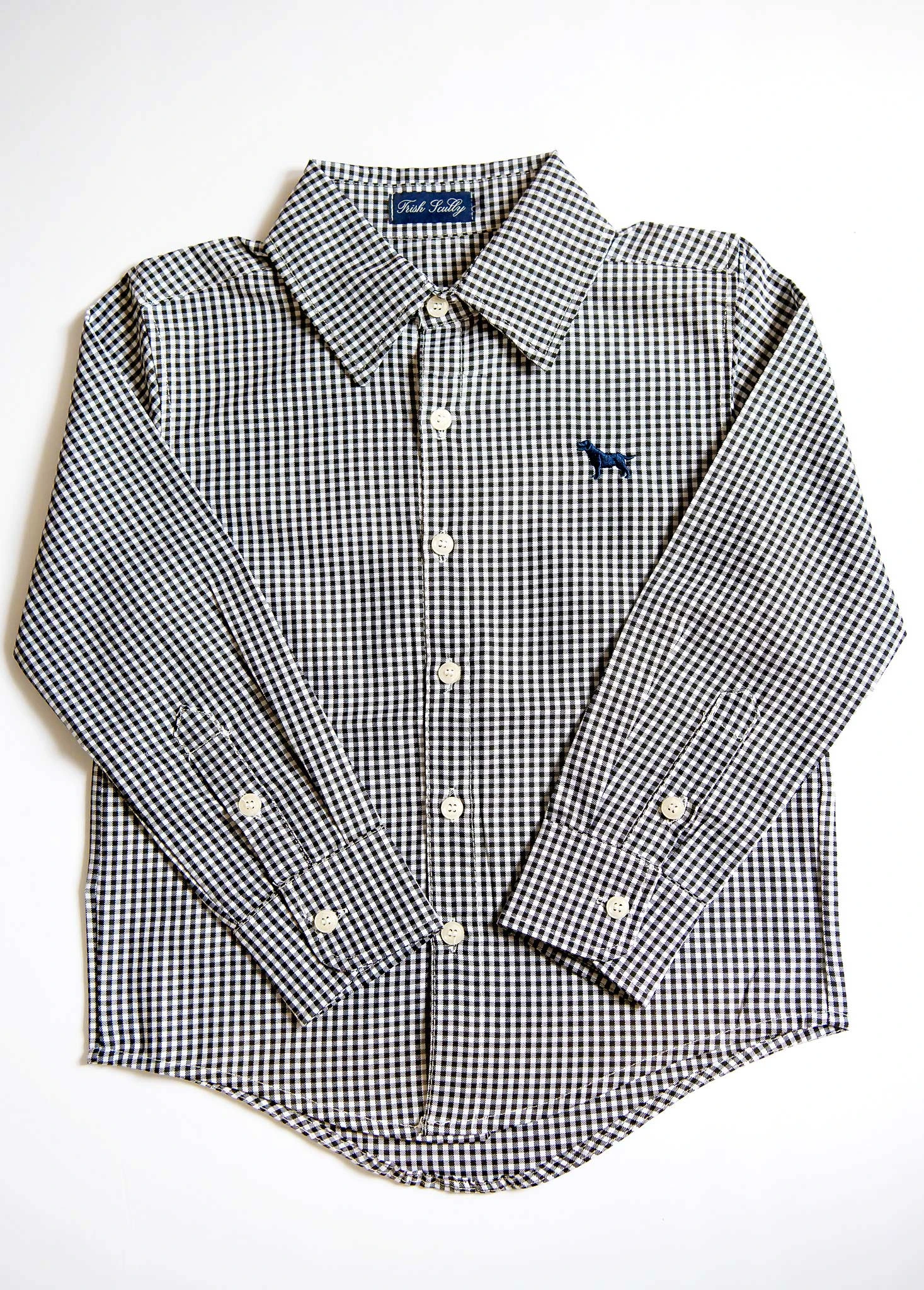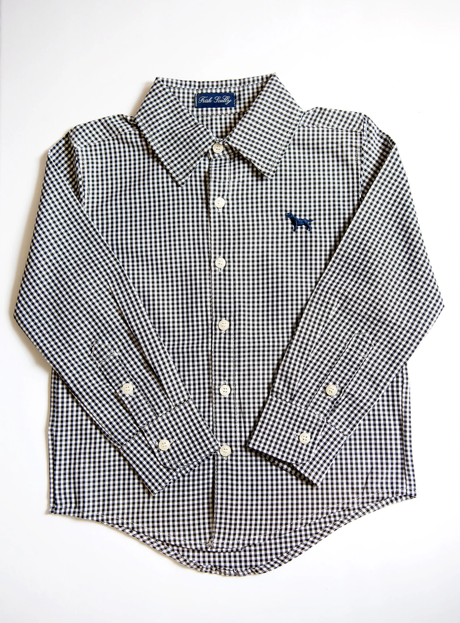 The most darling button-down for your little man! This classic long sleeve is made to be paired with just about anything, and finished off with a dog emblem. Pairs wonderfully with any of our suits or pants!Â