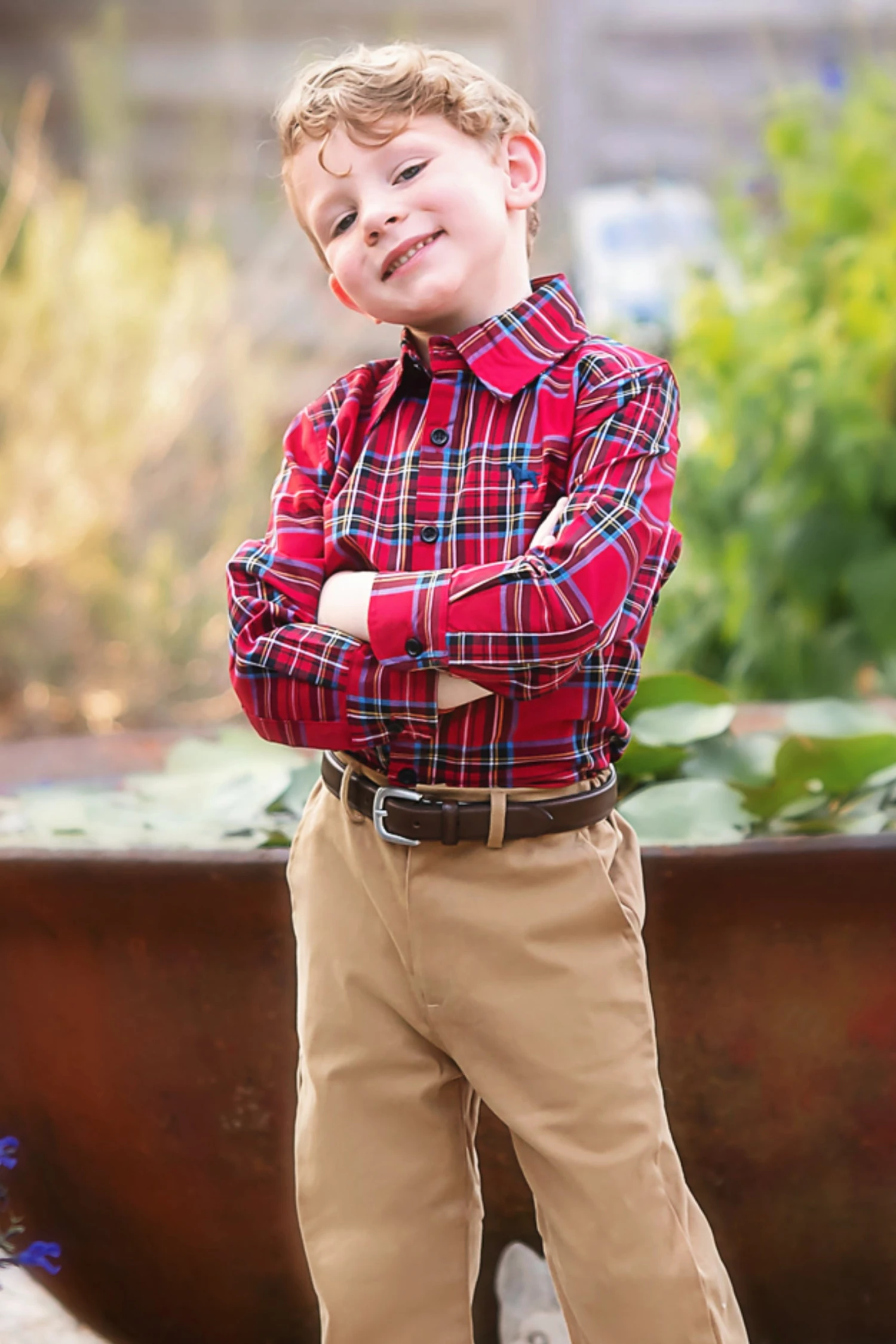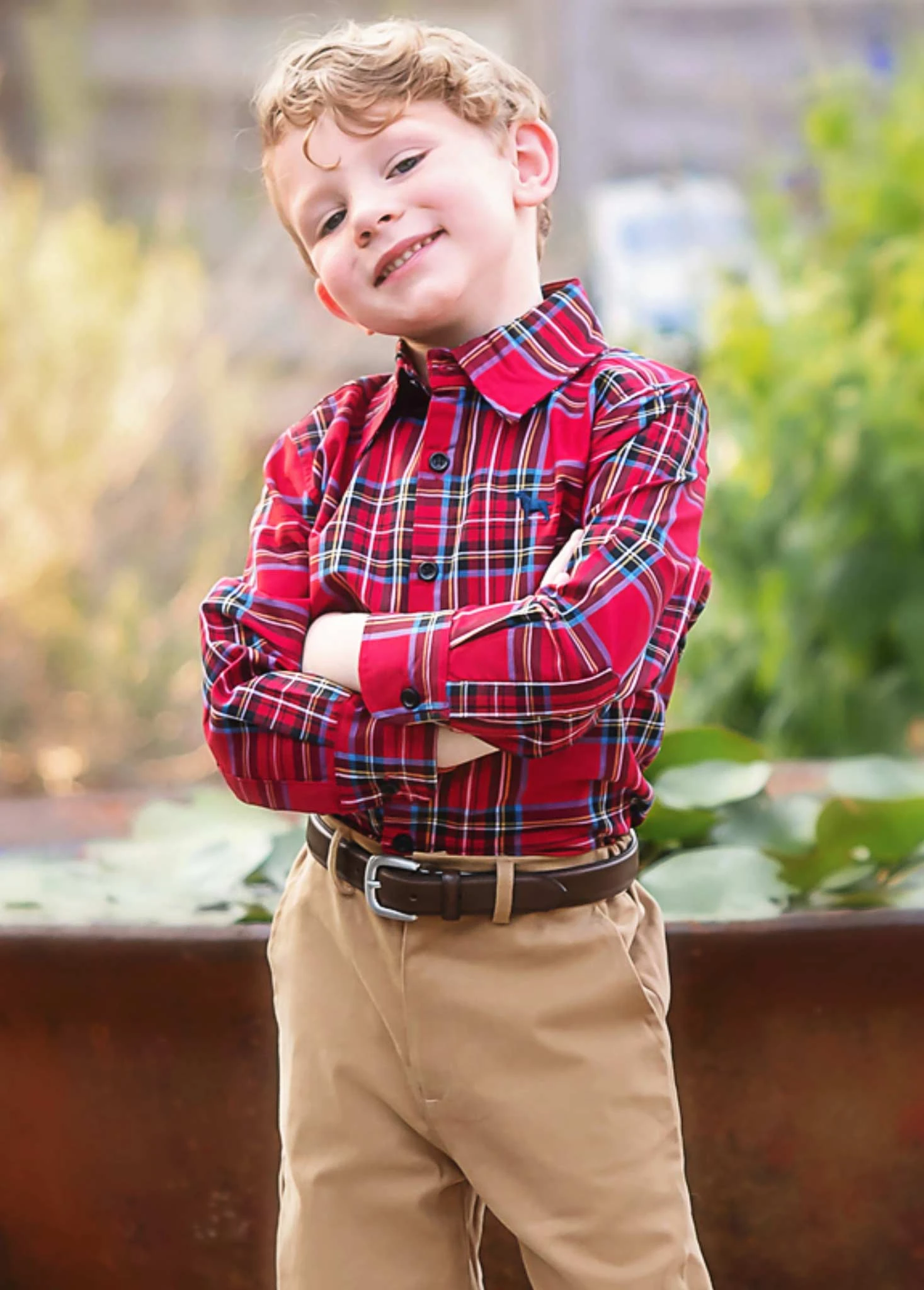 The most darling button-down for your little man! This classic long sleeve is made to be paired with just about anything, and finished off with a dog emblem. Pairs wonderfully with any of our suits or pants!Â