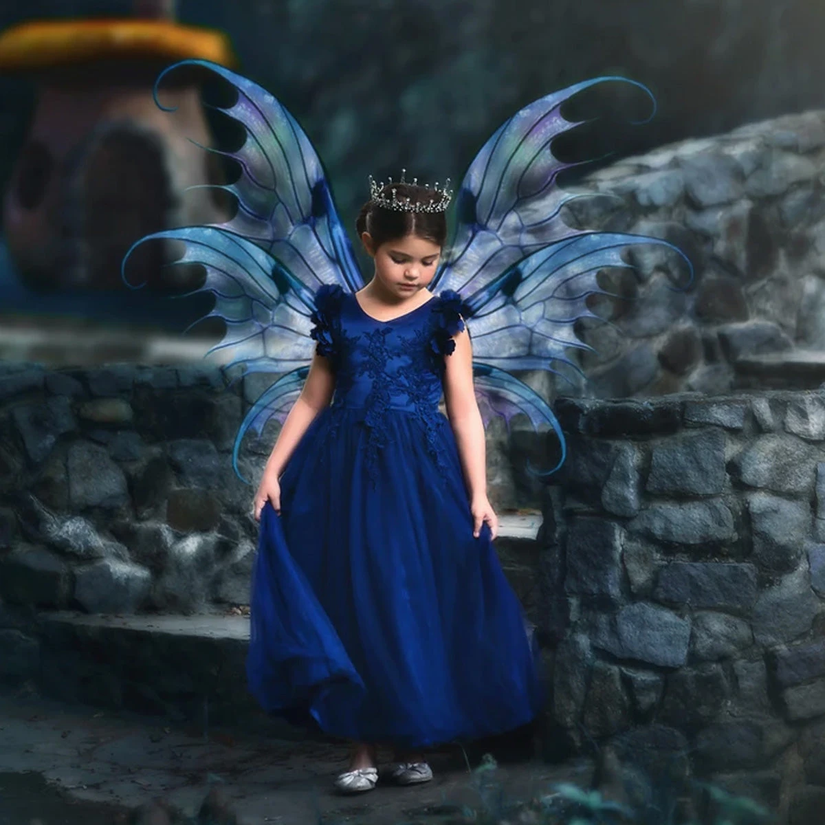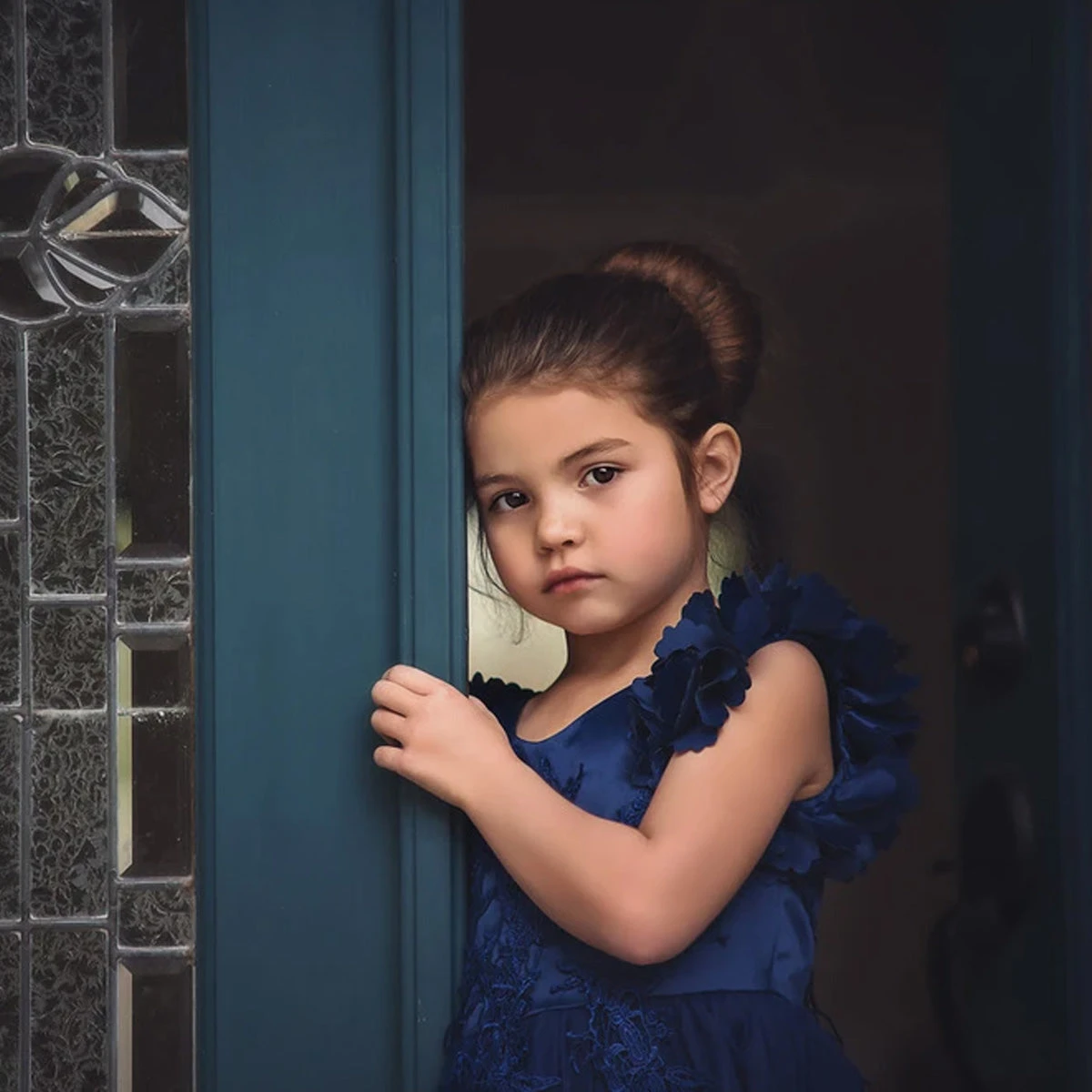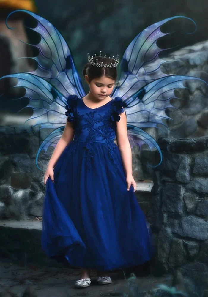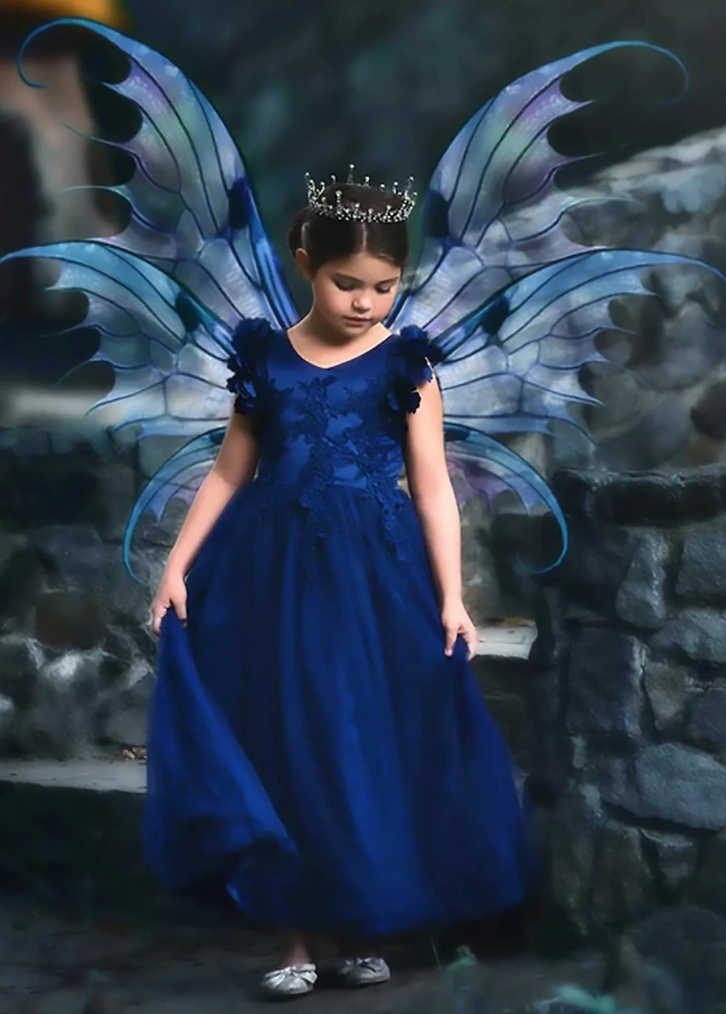 Fit for a princess, this dress has it all. Regal navy satin graced with a touch of lace, this dress is a showstopper!  Sleeves are embellished with whimsical die cut flowers that will have all eyes on her.  Tulling overlay skirt adds just the right touch of fullness and twirl. This is a gorgeous full length gown.  Fully lined with soft cotton, back zip.  100% poly self, 100% cotton lining. Machine wash, hang dry.Â