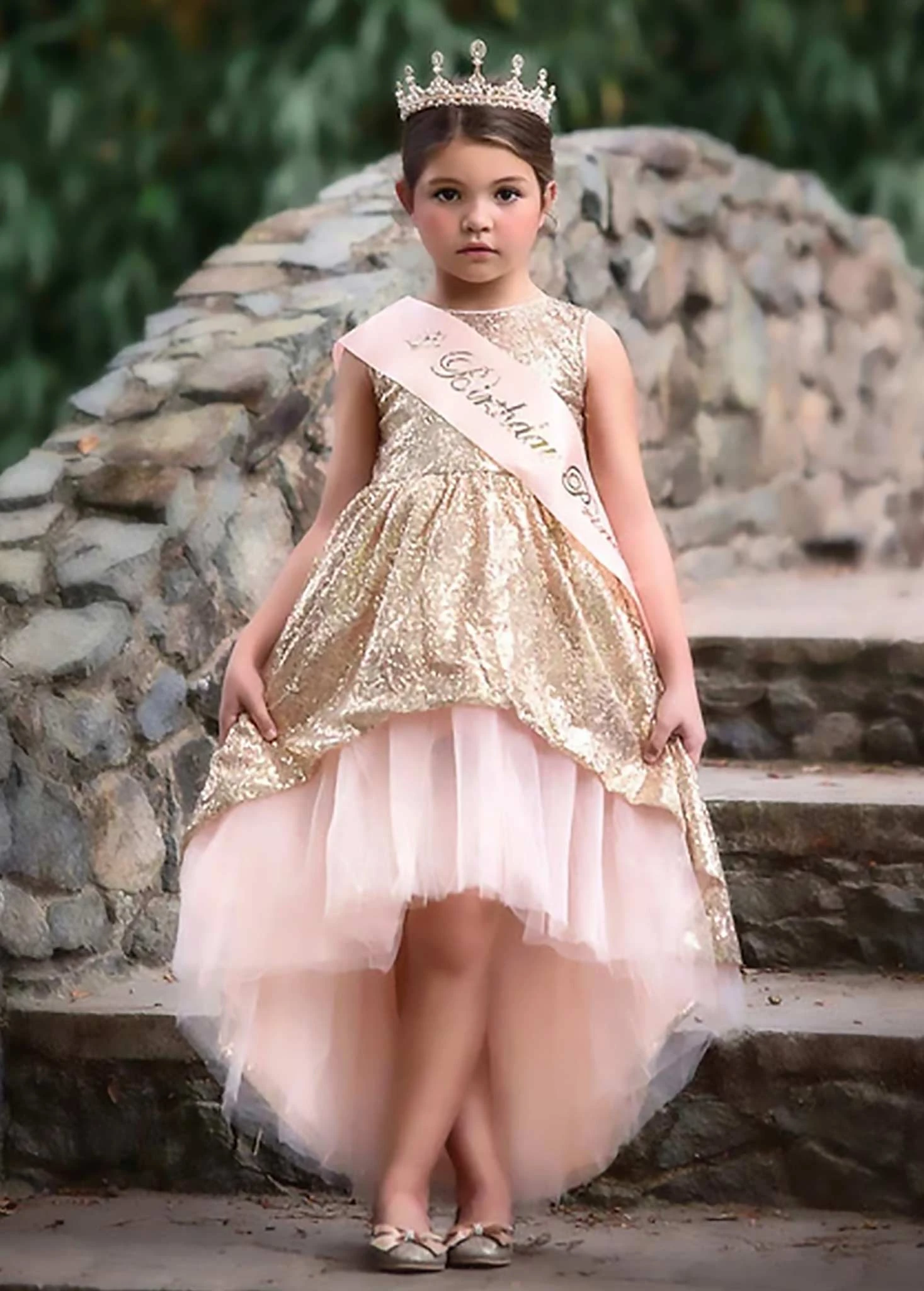 It’s HER day and she should shine! Made from the most popular birthday party colors, this birthday princess dress will have all eyes on her. The blush pink sequin bodice is pure perfection, perfectly trimmed with piping at the neckline and arms. The oh so twirly skirt will have your girl in a spin! This birthday girl dress is fully lined with soft cotton and made with our signature soft fabrications for the tactile sensitive child. The sash is completely removable and the dress can be worn over and over to her most special of occasions. Â