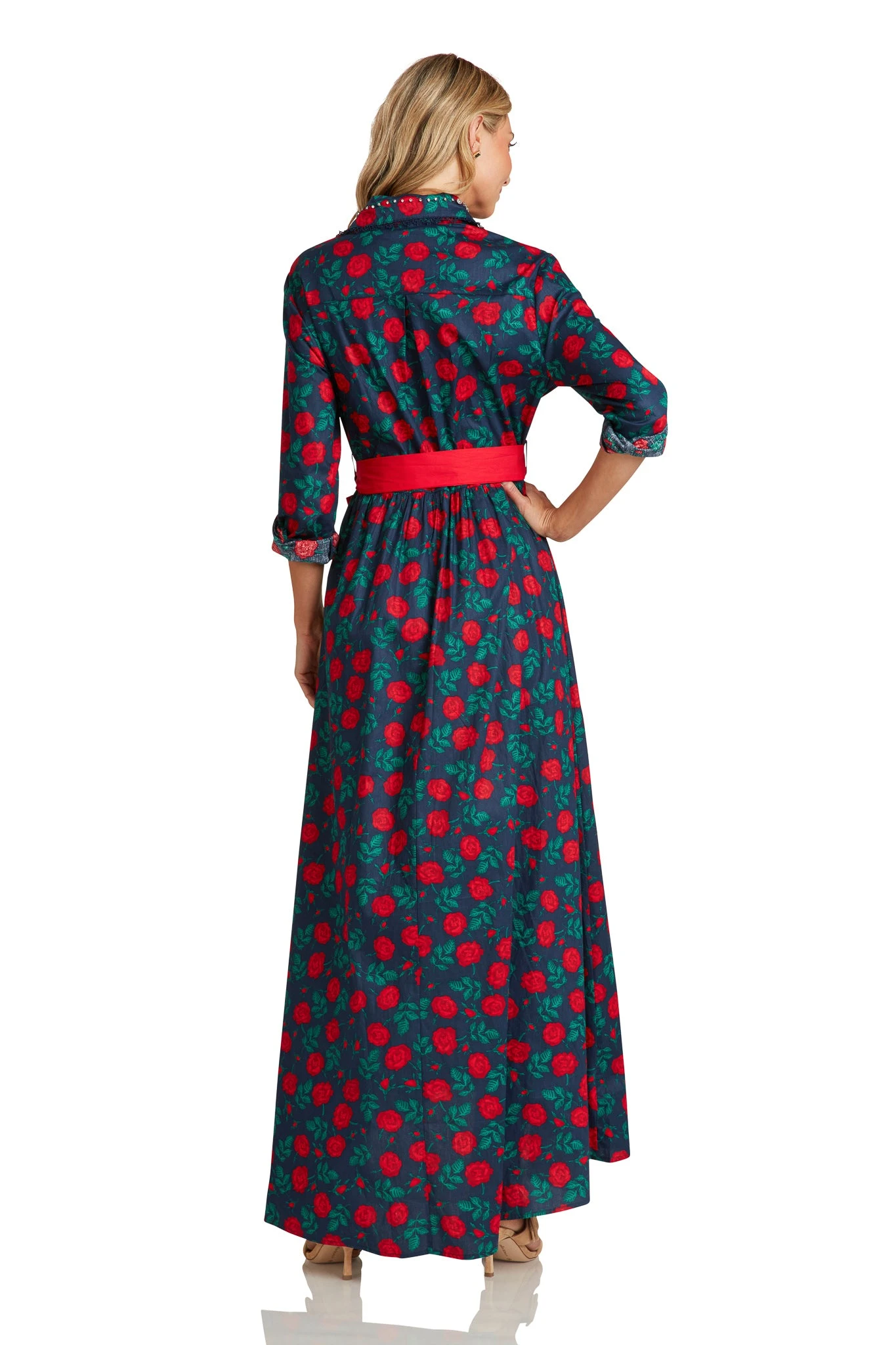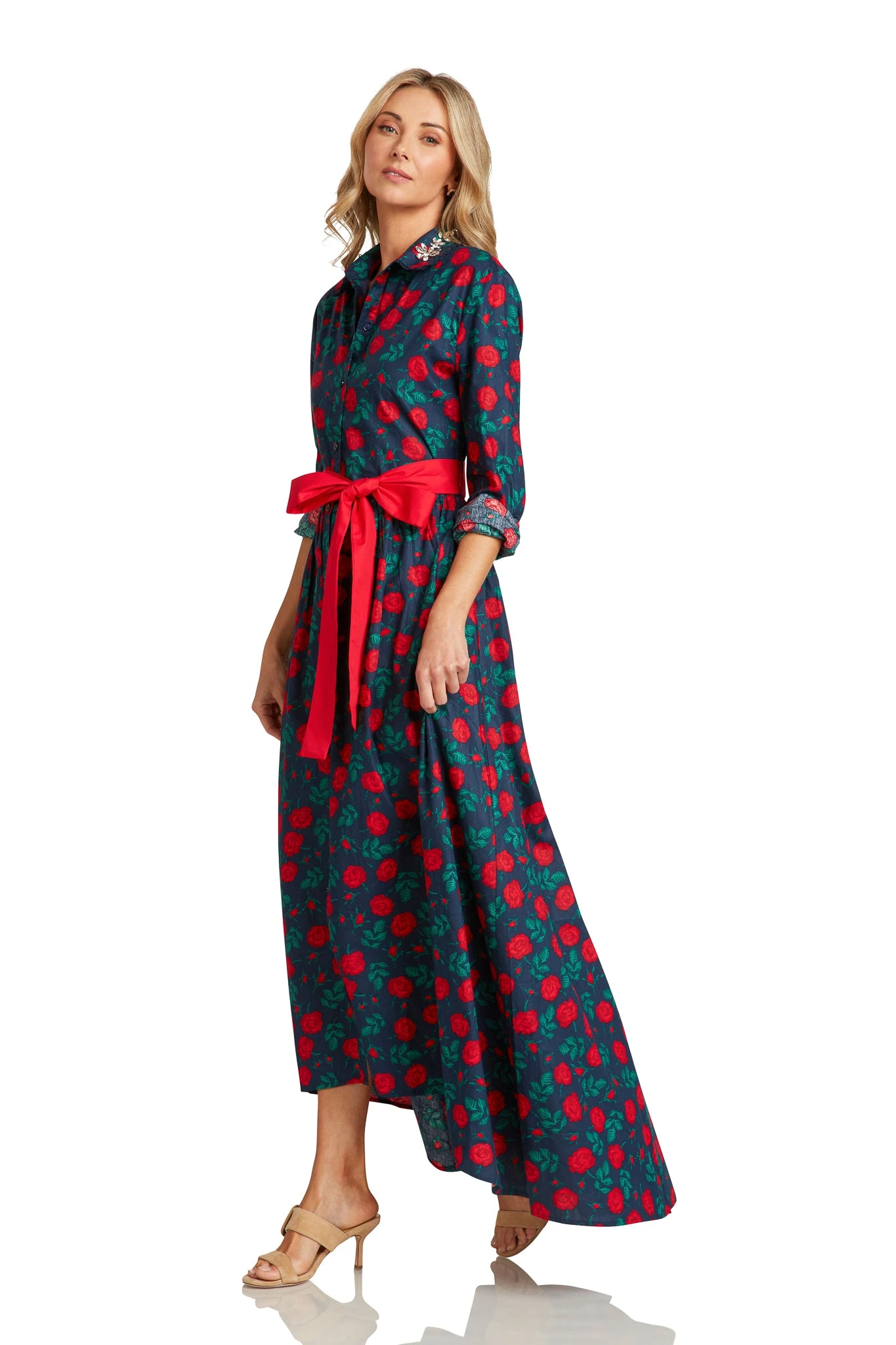 This stunning maxi is the ultimate head-turner. Our take on a classic shirt dress, this button-front maxi boasts a subtle hi-low skirt for an extra dramatic effect, a jeweled collar for that extra hint of sparkle and a removable waist tie for that perfect fit. This dress is truly a showstopper!Â