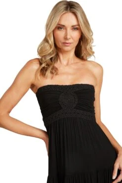 This hi-low style dress has a ruched center and a self-tie to accentuate the waist.Â