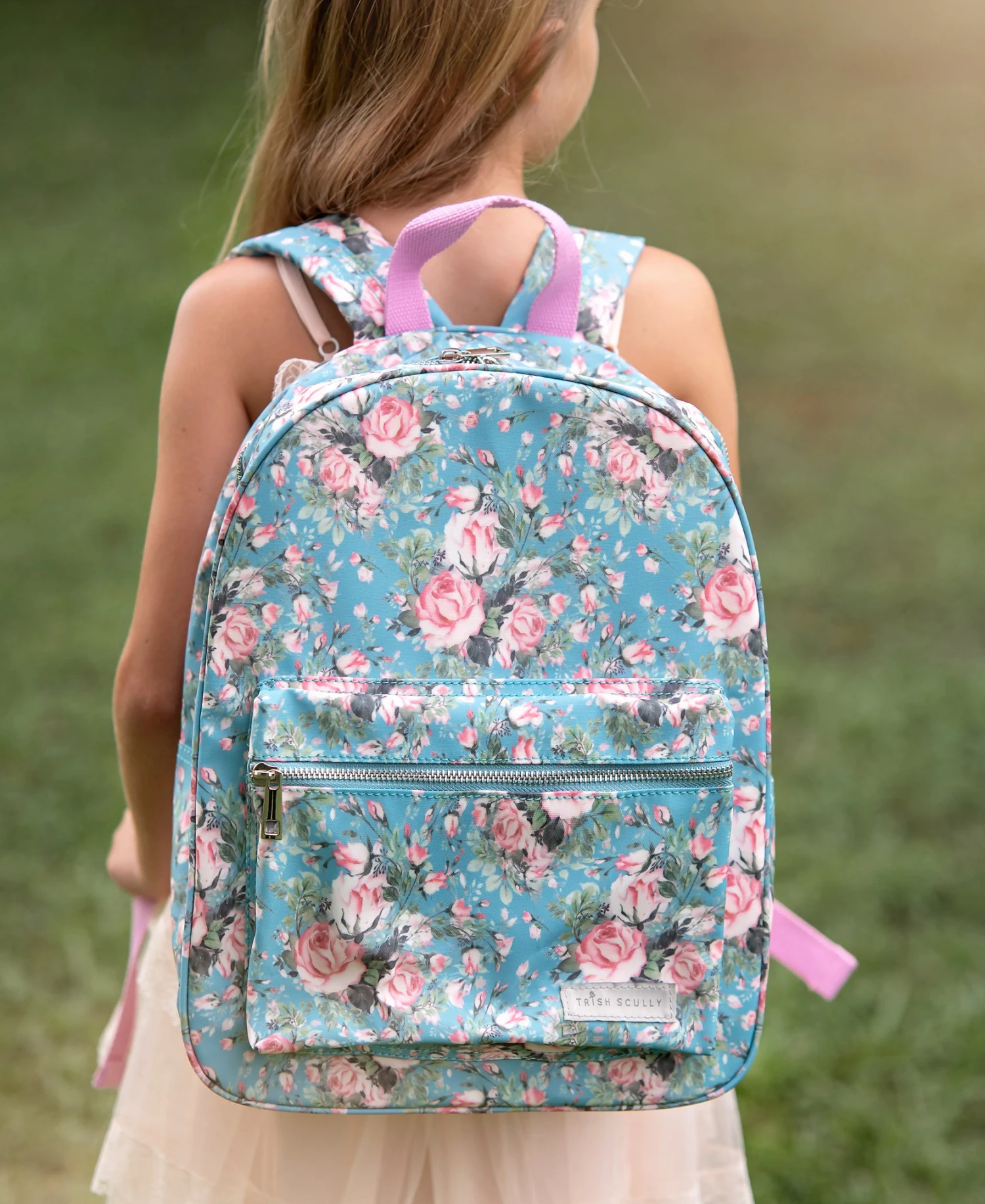 This darling floral print backpack features a front pocket for all of her favorite keepsakes and essentials. Perfect for school, play, sleepovers and more! Includes adjustable straps for the perfect fit.Â