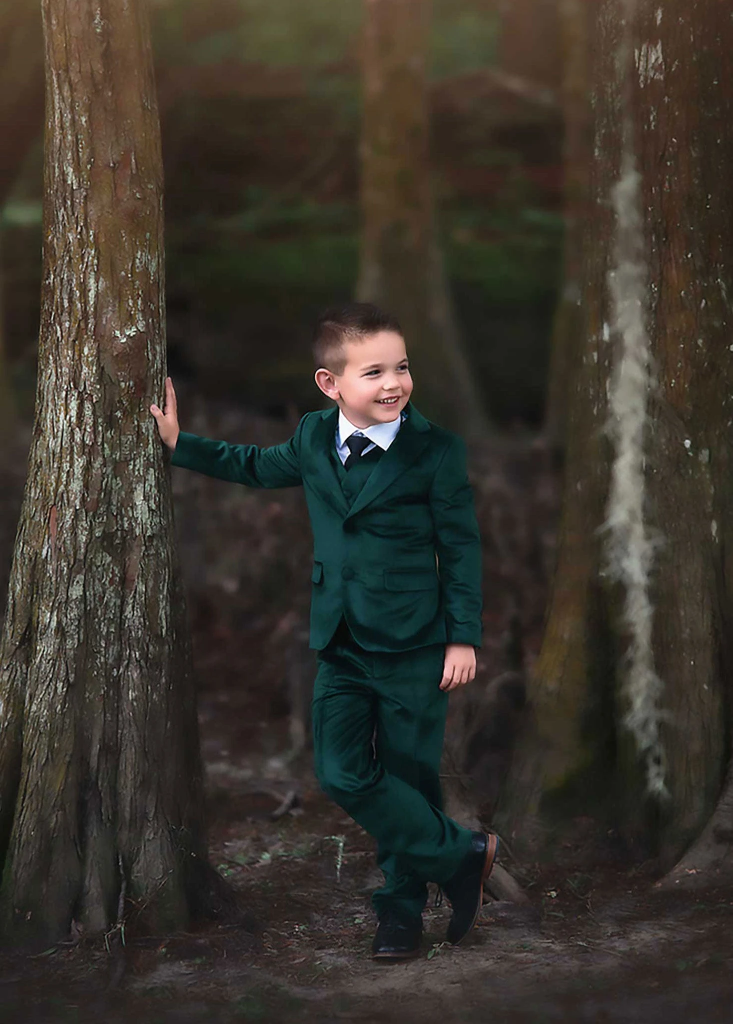 The quality is amazing on these, and for 3 pieces it’s a steal of a deal. Jacket, pant and vest will be coming to you, packaged beautifully on a hanger and in a keepsake suit bag. This luxurious emerald velvet suit is fully lined and finished just as beautifully on the inside as the out. This jacket has 2 hidden pockets to keep his special keepsakes. Vest has an adjustable back buckle and pant comes with adjustable elastic tabs inside, for just the right fit. 70% poly 30% cotton, 100% poly lining. Dry clean only. Model is wearing a size 5 and is 5 years old. These run true to size.