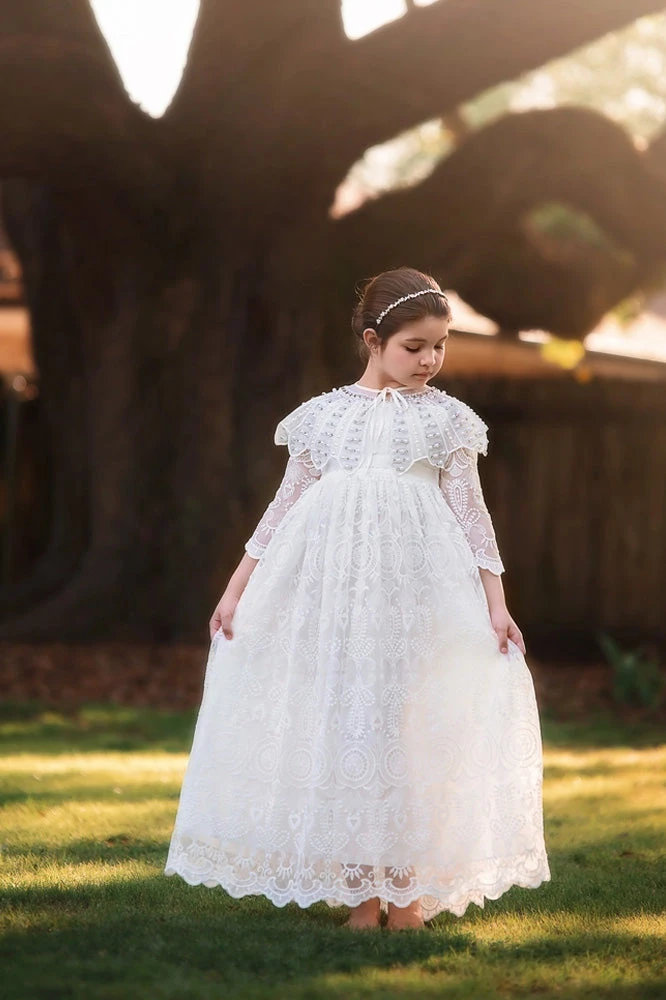 This jeweled cape is a gorgeous addition to her gown! Pearls and rhinestones embellish a beautifully embroidered scalloped edge cape. This is a substantial piece, you won’t believe you paid so little for such luxury! Fits sizes 3-10. Mode is size 10 in our photograph.