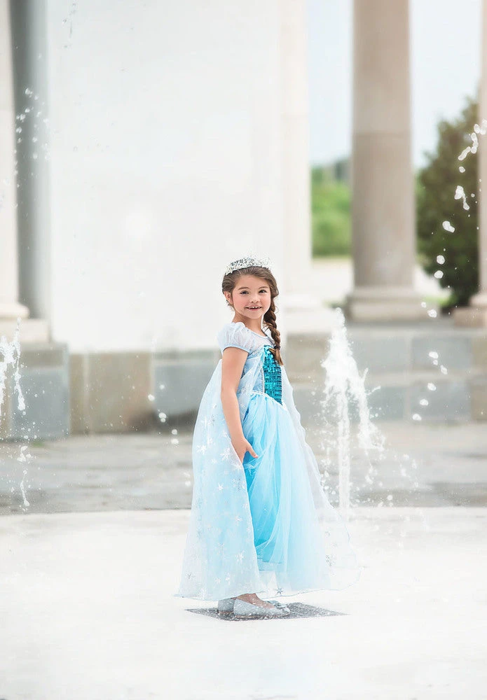 One of our most adorable Ice Queen costumes, this dress will not disappoint with all it’s cuteness! The sheer embellished cape is attached to layers of tuling and a sparkly sequin bodice. Finished off with puff sleeves and sweet trim, this dress is a real gown and not a cheap plastic costume. We are never itchy and never use glitter! A tremendous value for such cuteness. 100% poly self, fully lined and back button. Hand wash, hang dry.  DO NOT WASH IN MACHINE, OR SNOWFLAKES WILL COME OFF. DON’T FORGET HER MATCHING DOLL DRESS!Â