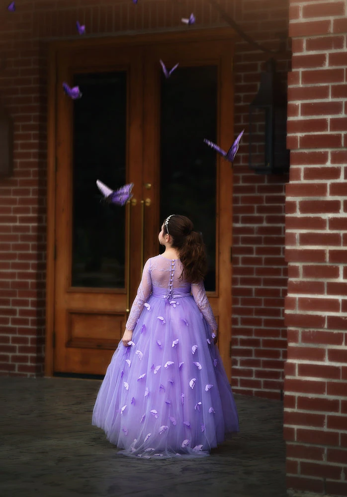 *A lavender Mariposa gown with a long train, graced with butterflies and a pearl center.