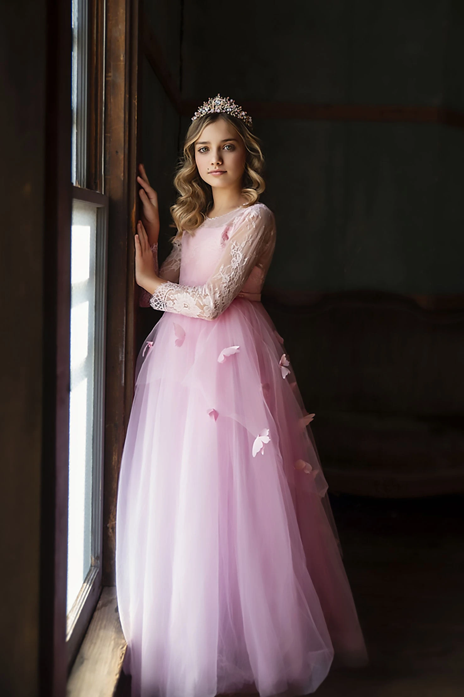 Introducing our most amazing gown to date! This butterfly gown is truly a work of art, with die cut butterflies trailing down the train of the dress. The soft lace bodice and sleeves, finished off with a hand beaded belt is fit for royalty. Covered satin buttons and a lace up back make for just the right fit. This gown will knock your socks off and you won’t believe you paid this little for a gown of this quality. A work of art for a magical photo shoot! Hand wash or dry clean. 100% soft poly, not scratchy for the little ones.