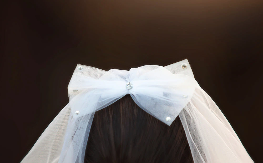 This gorgeous bow top veil has just a hint of sparkle with all the right sweetness. Two layers of ruffled edge tulling finish off the look with a hair comb for easy attachment.