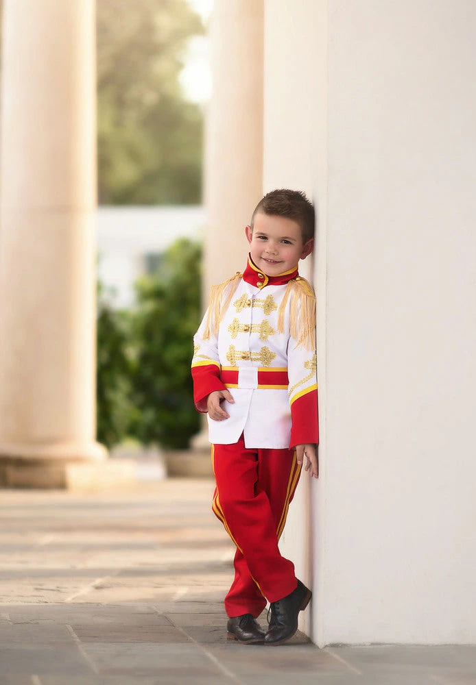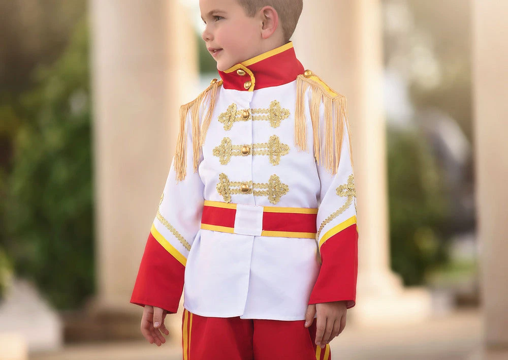This darling prince costume will have imaginations soar! The regal jacket has all the royal splendor, with gold trimmings, fringe and handsome buttons. The royal pant has side stripes and elastic waist for just the right fit. Belt is completely removable and finishes off the look. 100% poly, machine wash, hang dry.Â