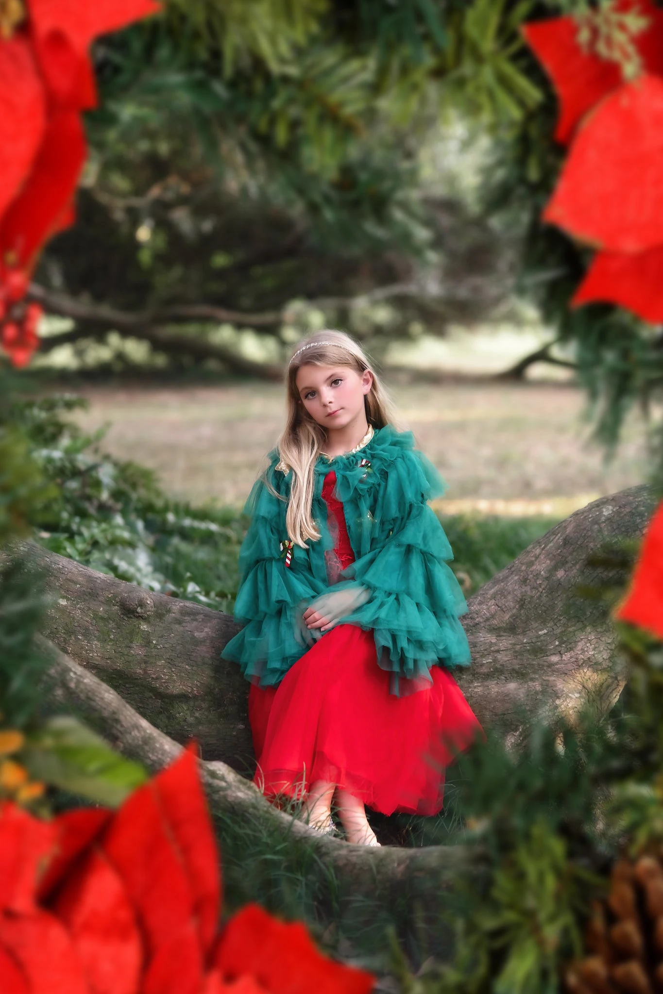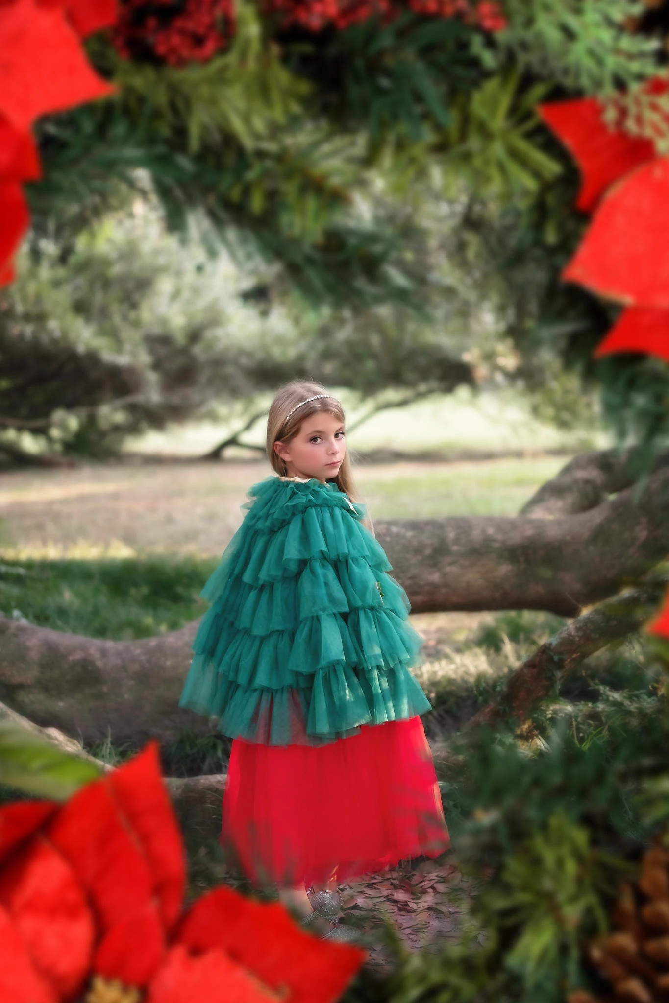 The most darling cape to complete her holiday look! Layers upon layers of ruffled tulle grace this cape, adorned with 8 removable pins for her to customize her look. Pairs wonderfully with any of our gowns for an extra special, formal look, and doubles as a whimsical dress-up piece to be worn at home!Â